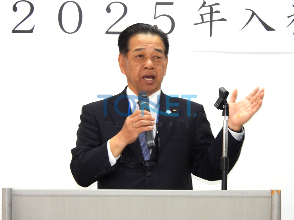 代表取締役 馬場善志雄は「TONETグループは50年に渡り当業界で成長を続けてきた会社。この春も大規模新規案件が複数始まるなどという状況にあり、新入社員の皆様にも多忙な新生活のスタートをお願いすることになるが、先に入職した先輩方とともに末永く活躍していただきたい」と祝辞を述べ、新入社員一同は期待や緊張の表情を浮かべながら真剣に耳を傾けていました。