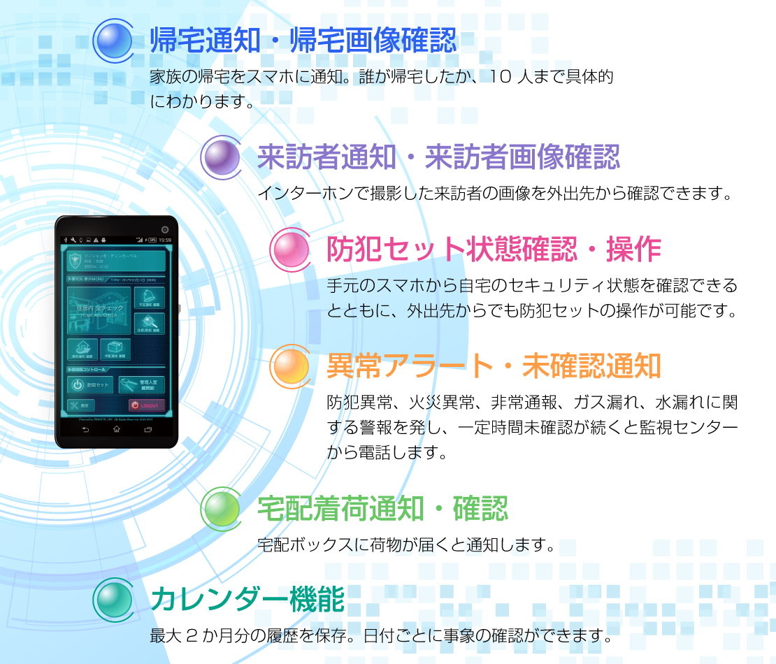 マンション等に標準装備されている、パナソニック社及びアイホン社製マンションインターホンに接続して利用できるシステムが、入居者様の安心を創造します。スマートフォンアプリで住居に係るさまざまな確認や操作を自身で行うことができるほか、システムの状況や発生事象は、TONETの有人監視センターが昼夜を問わず監視。発生した事象の状況に応じて指定された連絡先へ直接電話するほか、必要に応じて警察や消防などの公的機関へ速やかに通報します。
